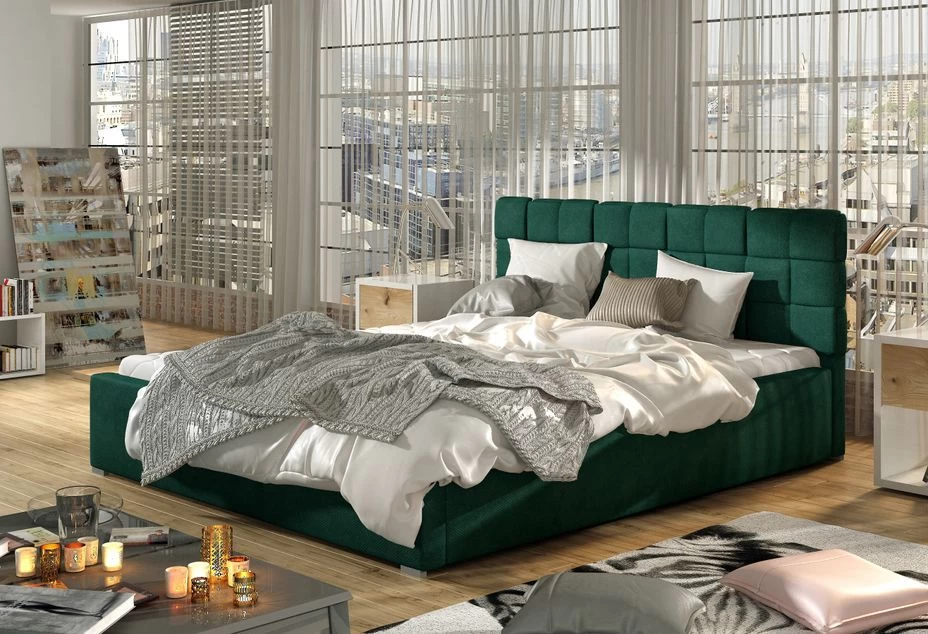 Les lignes modernes du lit sont accentuées par des garnitures de bon goût et des pieds en PVC au style élégant. Le cadre et la tête de lit sont rembourrés de mousse T25 douce et résistante. La tête de lit présente des coutures à motifs carrés qui imitent le capitonnage et s’agencent bien aux chambres modernes.