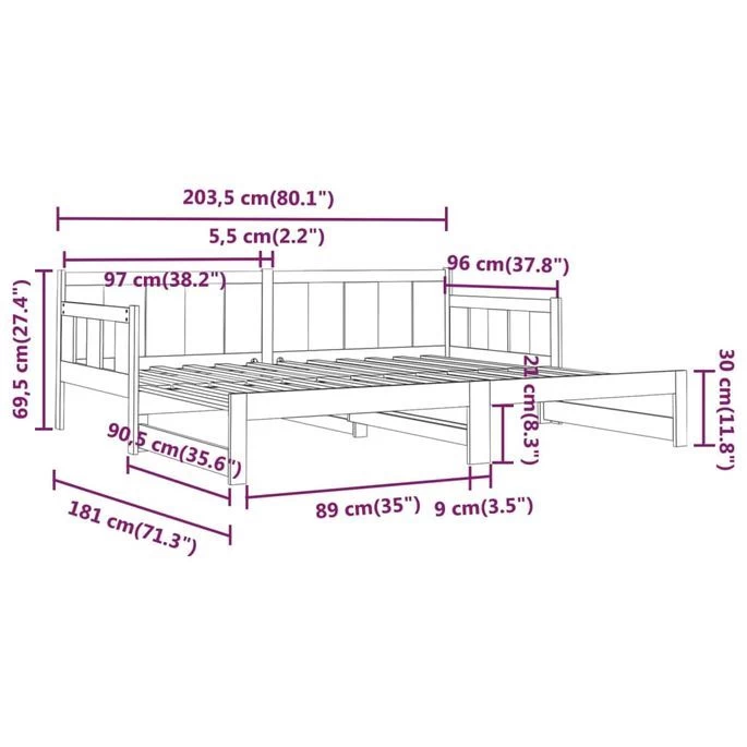 Dimensions totales (non étendues) : 203,5 x 96 x 69,5 cm (L x l x H)