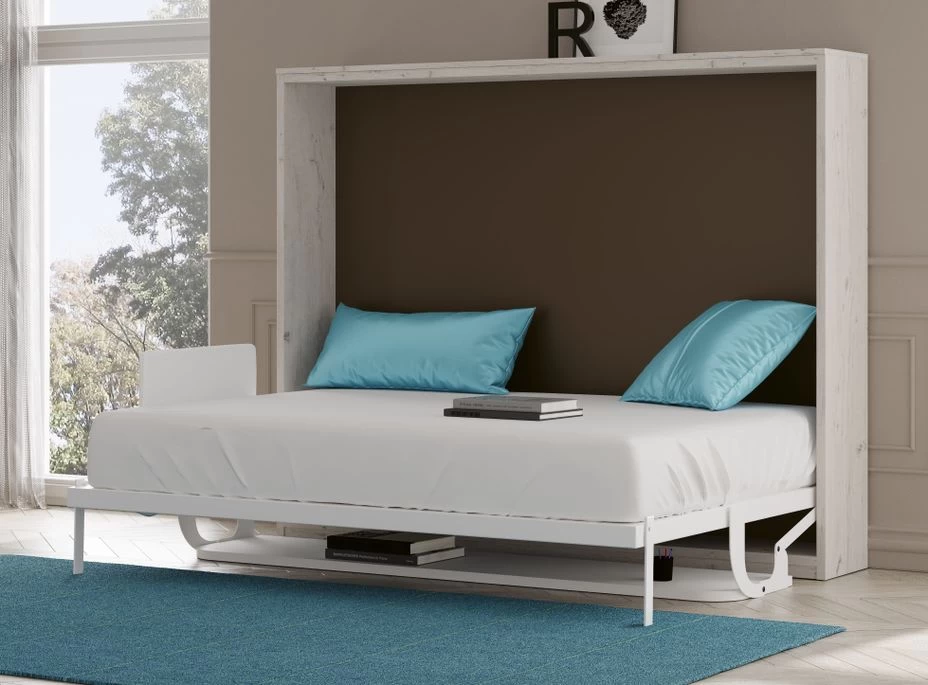 Son sytème de piétement à retournement manuel à bascule permet une ouverture simplissime : tirez légèrement la poignée vers vous, rabattez les pieds et l’armoire-lit s’occupe du reste.