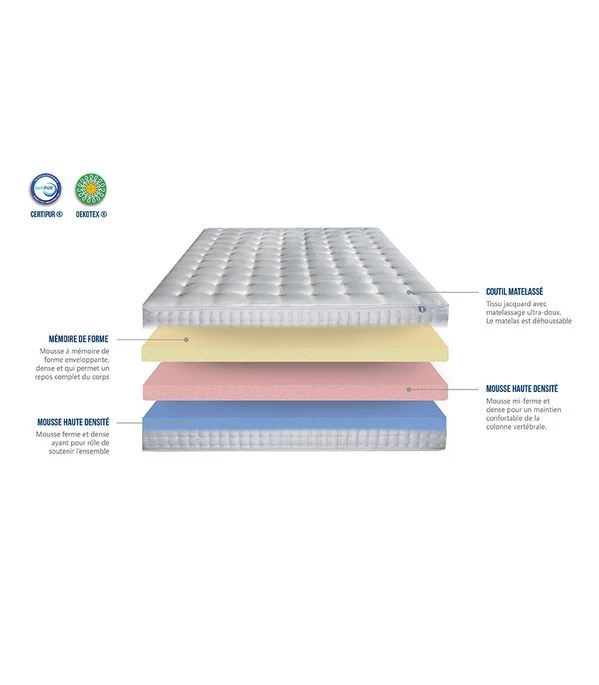 Ame: 7 cm de mousse Haute Densité de 35 kg/m3 Ferme + 7 cm de mousse Haute Densité de 35 kg/m3 Medium + 7 cm de mousse à mémoire de forme de 50 kg/m3